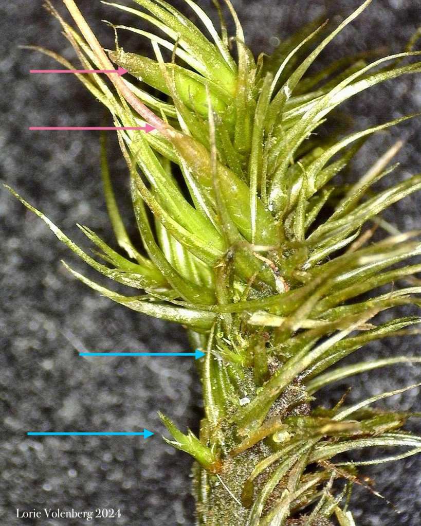 The blue arrows are pointing towards male plants on this female gametophyte. The pink arrows are pointing towards mature sporophytes.