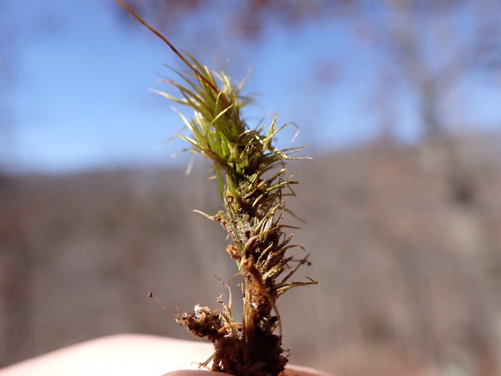 You might notice a little tiny male plant hanging out on the side of the stem. Roughly 20% of Dicranum species are pseudomonoicous whereby the male plant is tiny and epiphytic on the rhizoids of the female plant. This male dwarfism is also called nannandry. What’s more, Dicranum scoparium takes it a bit further by also having the ability to have full sized male plants. Research suggests that this is an environmentally controlled situation.