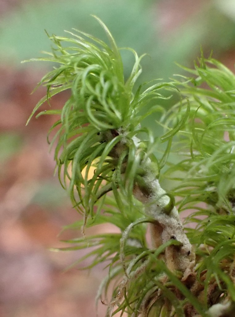The beautiful Dicranum scoparium moss is unmistakable in its windswept appearance. The white or brown fuzzy tomentum obscuring the stem will help to secure its identity if one is in doubt. While looking at the tomentum of a female gametophyte with a sporophyte, you might notice something peculiar….