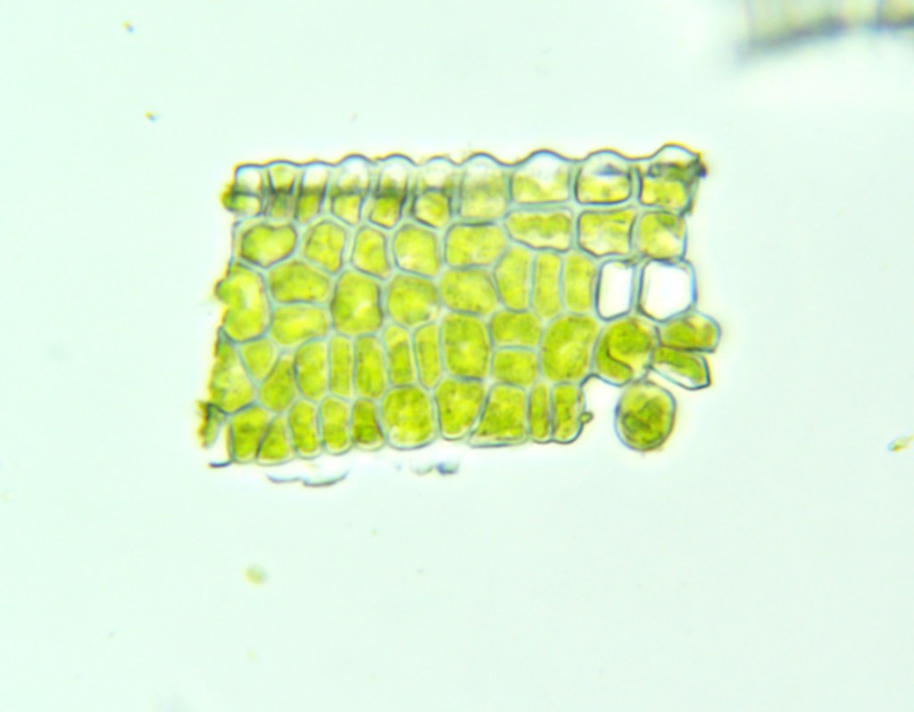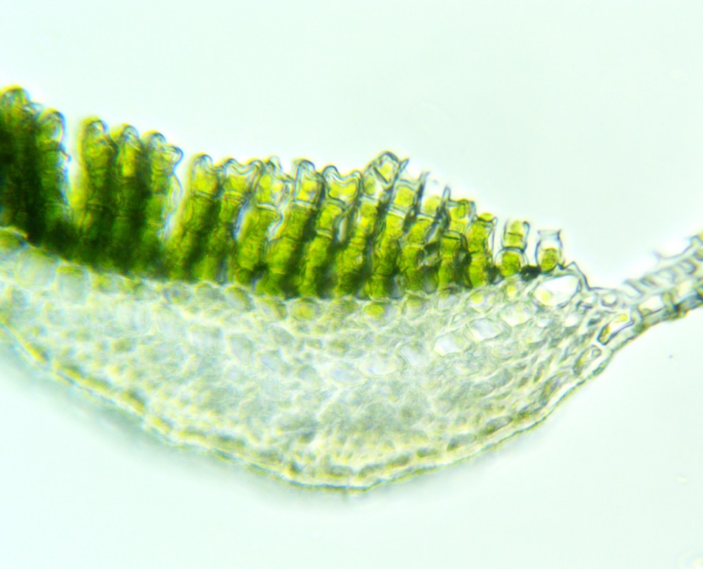Left: Polytrichum commune in the swale; Middle: Many of the apical cells are cup shaped; Right: The apical cells form a crenulate outline from the side.
