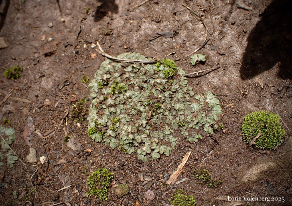 Left: A happy colony showing its rosette pattern with dichotomous branching of the thalli; Right: The blunt cilia are notable around the edge of the thallus.