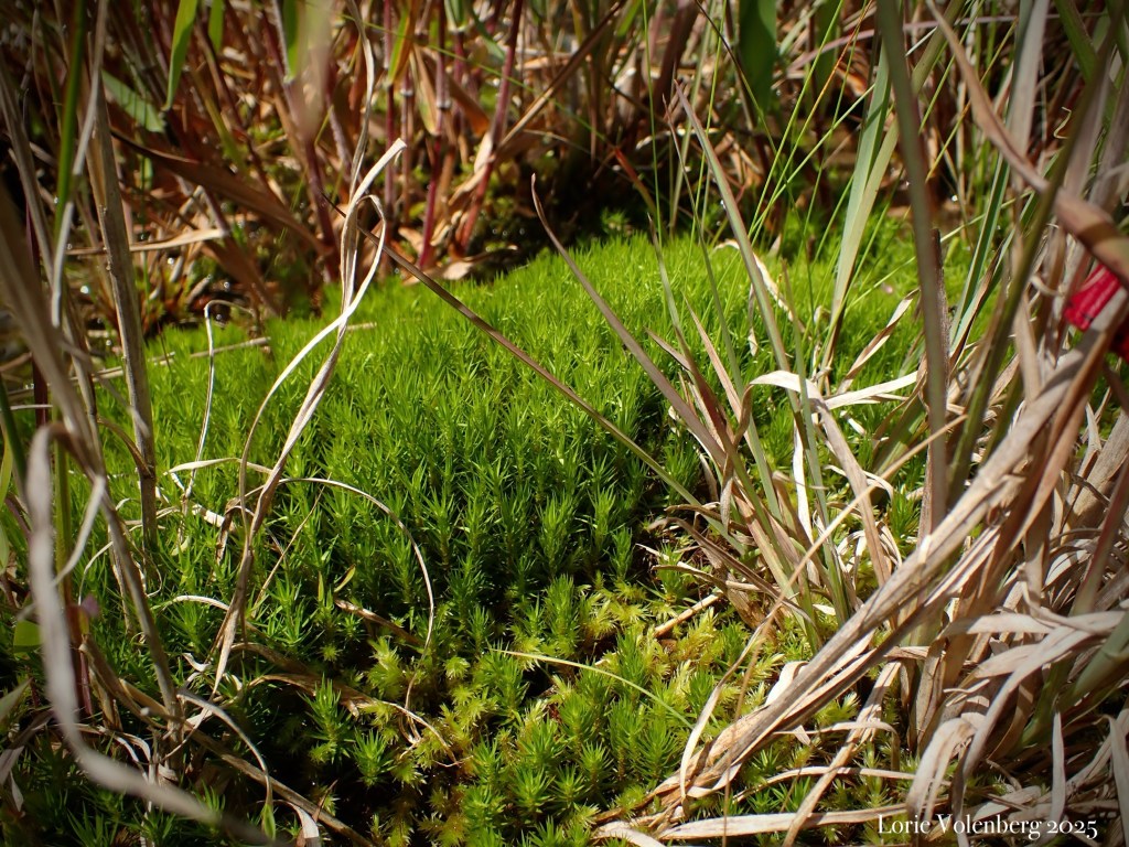 Polytrichum commune is one of our two Polytrichum species known in Missouri that do not have the marginal lamina wrapping around the lamellae. P. ohioense is the other species. Habitat can help determine species when sporophytes are not present, and finding one in the swale is a pretty much dead giveaway for P. commune as it likes boggy, moist areas (though it can be in drier locations). If one is not sure, cross sections will verify the identity. The apical cells on the lamellae strips will often be cup shaped, and when a strip is viewed from the side, the apical cells will form a crenulate outline.