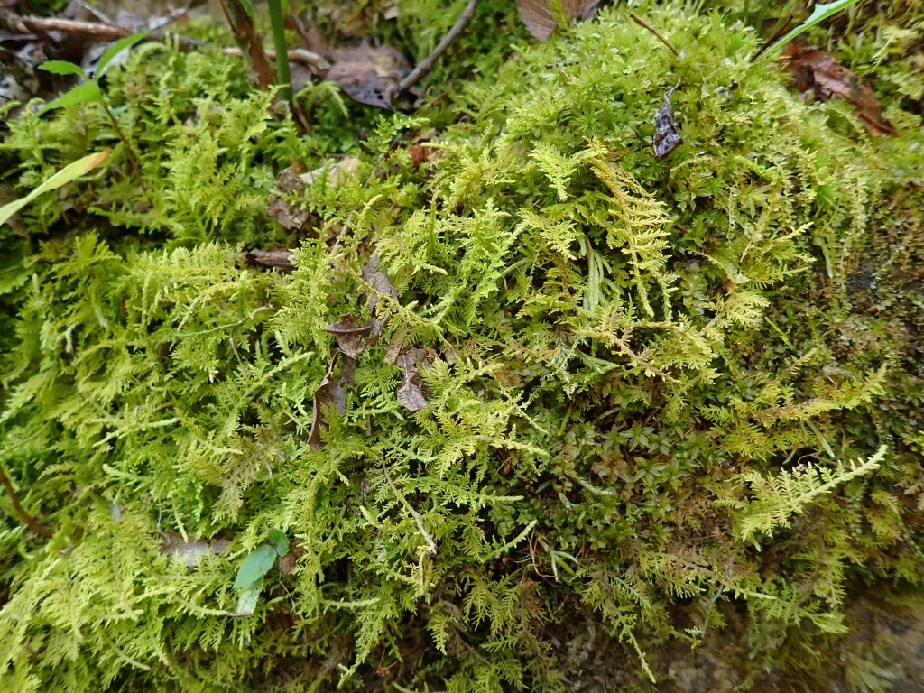 In the dark, cool waters of the spring entrance itself, were these large masses of the moss Fissidens fontanus. This water loving moss prefers slower moving water and indeed, the water flowing out of this spring was quietly meandering from the entrance. It is often a dark colored moss being coated in various particles found floating in the water, with only the growing tips being bright green.