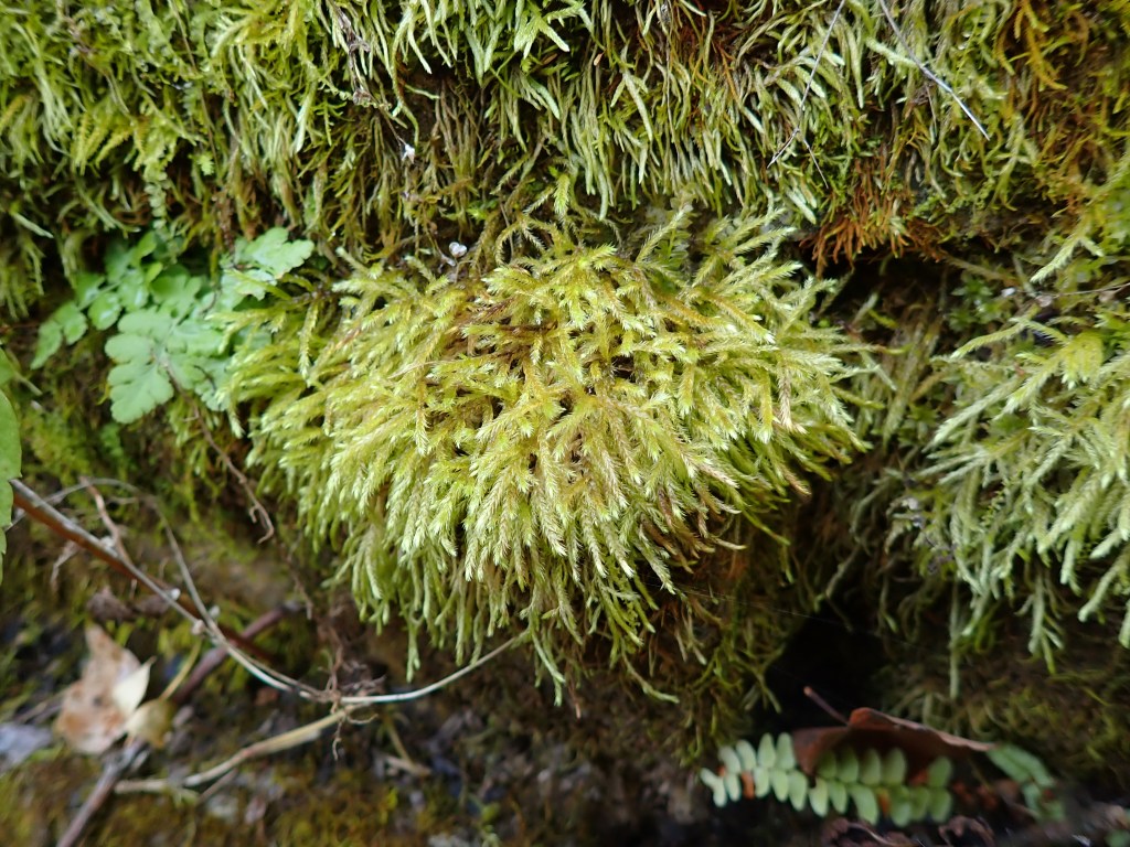 Plagiomnium cuspidatum was happily growing all over this wall. Since P. ellipticum has been recorded for this park, I checked this population for the presence or absence of decurrent leaves, and how the teeth were expressed. This population did have decurrent leaves, immediately ruling out P. ellipticum, and the teeth were relegated to the distal half of the leaves, leaving this to be P. cuspidatum.