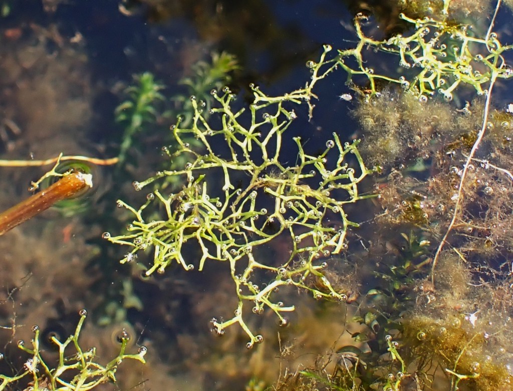The real goal of this hike was to search for two liverwort species reported from here, Porella pinnata and Ricciocarpos natans. Sadly, neither were found, but we did find a new liverwort species to add to the park’s bryophyte list, Riccia fluitans. This unique liverwort is the only Riccia species that is found free floating in still water. All others are grounded to something. Its long, linear, and dichotomously branched thallus make it easy to identify in the field.