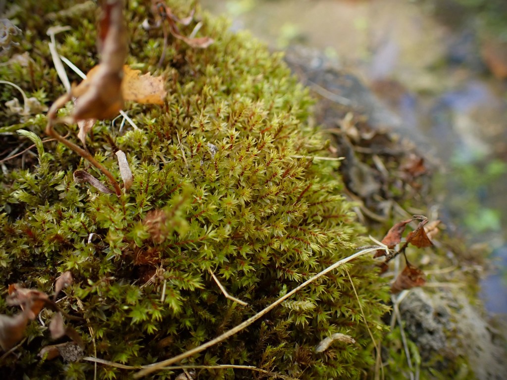 Hypnum curvifolium stood out with its falcate and secund leaves. Though this species was found mostly around the edge of the man-built pond, it did pop up here on the stone wall. I did verify its identity under the microscope at home as Hypnum species can be challenging to identify in the field.