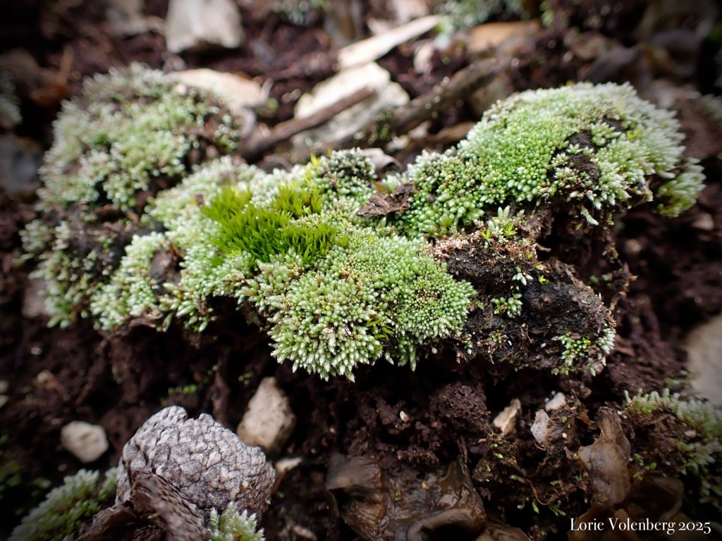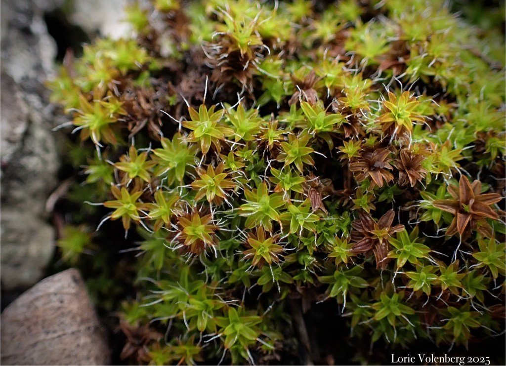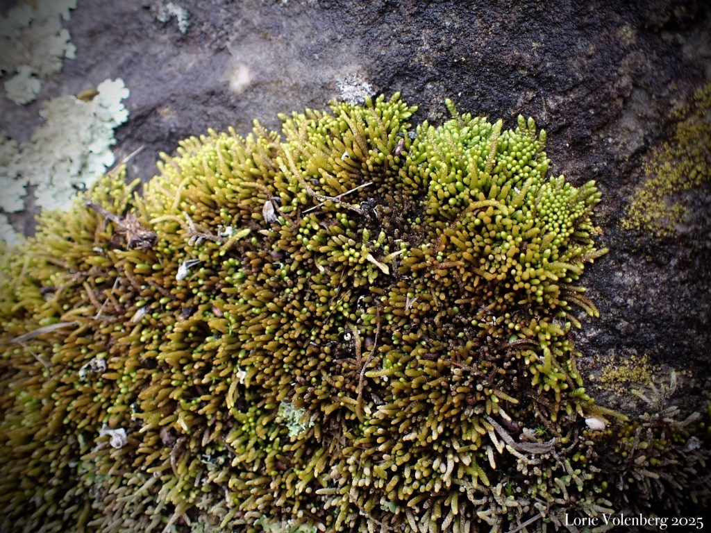 At the edges of, or in protected parts of the glade, usually near the shade of a tree, shrub, or the side of a rock ledge, I can find the lovely and colorful, Syntrichia ruralis, along with Tortella humilis.