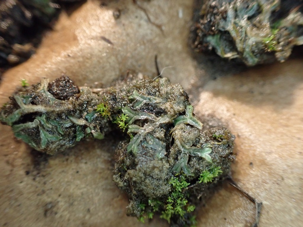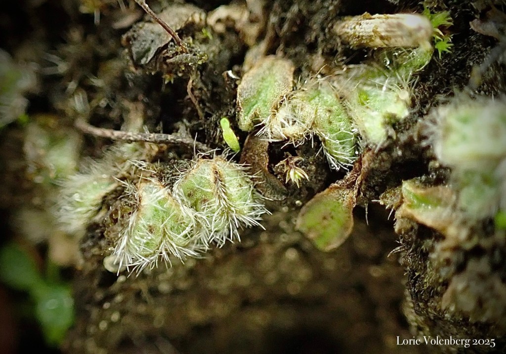 Once at the sandstone glade/savannah, I began to investigate patches of bare soil, along with the more protected edges of the sandstone ledges. Several liverwort species were present. Reboulia hemisphaerica clung to the shaded areas of sandstone, bringing some color to the tan stone with its purple edges. Three species of Riccia were found on the soil. One is fairly common: Riccia beyrichiana, one is less common: Riccia sorocarpa, and the last ended up being a new record for Missouri: Riccia trichocarpa. The last one was truly exciting to come across with all those long hairs!