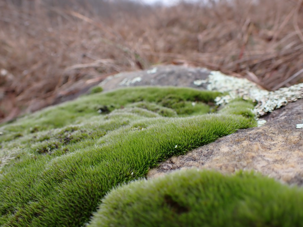 Ramifications of climate change aside, it was a lovely day that was hard not to pass up for a jaunt outside. I tried not to judge too harshly the conditions that brought this day into existence, especially considering the 50 degree drop in temperature that would happen that afternoon. I needed to take photographs of biocrusts for an article I was writing. The overcast day coupled with the damp weather meant the bryophytes would be easy to photograph while in their full, hydrated splendor. So, I decided to pay a visit to my favorite little park, Graham Cave State Park.
