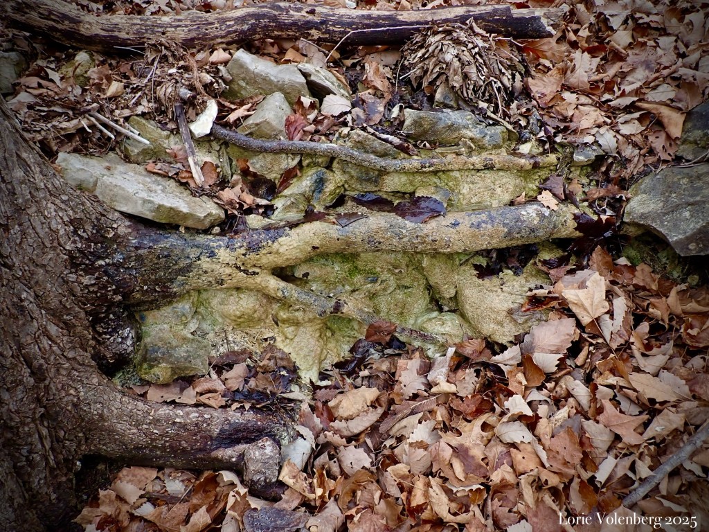 After I had my fill of crawling on the ground and searching the sandstone rocks, I headed back to the car by following the seasonal creek up to its one tributary that always has a little bit of water running from underground springs trickling through. A beautiful population of Fissidens adianthoides resides on the soil at the edge of a little waterfall. Further up, calcium buildup from calcite in the water being deposited as tufa, was forming over tree roots and rocks that created a little fall.
