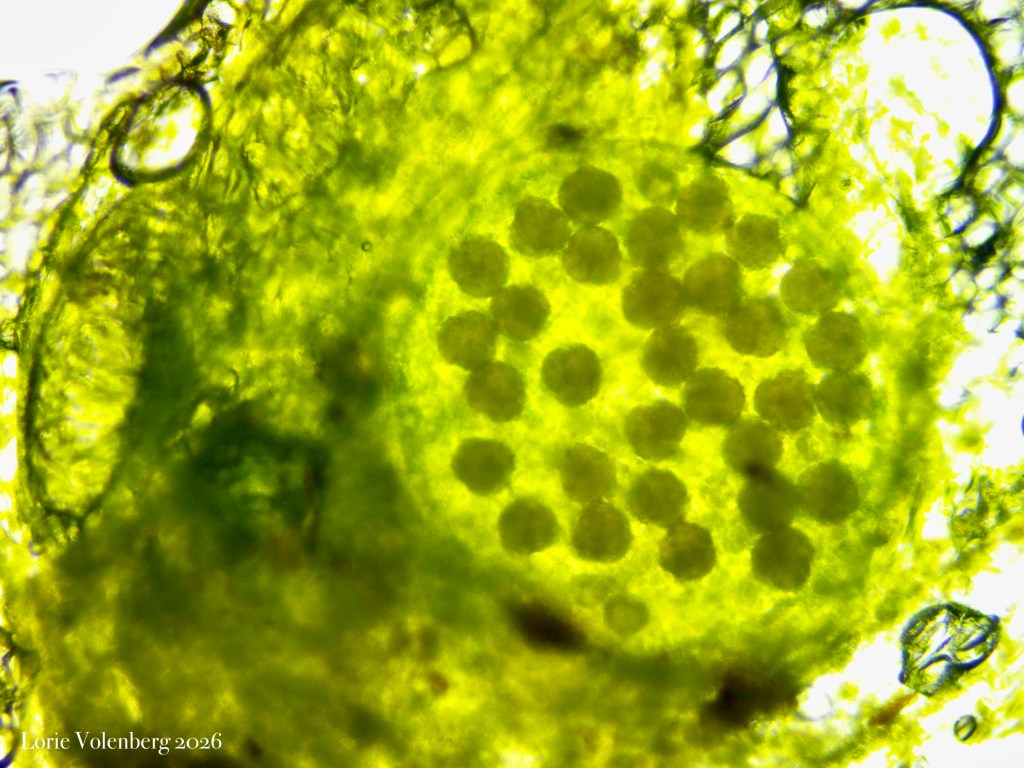 An involucre under the microscope at home shows a maturing sporophyte inside. At maturity, the involucre will decay, thus exposing the capsule to the elements which will then break open to release the spores.