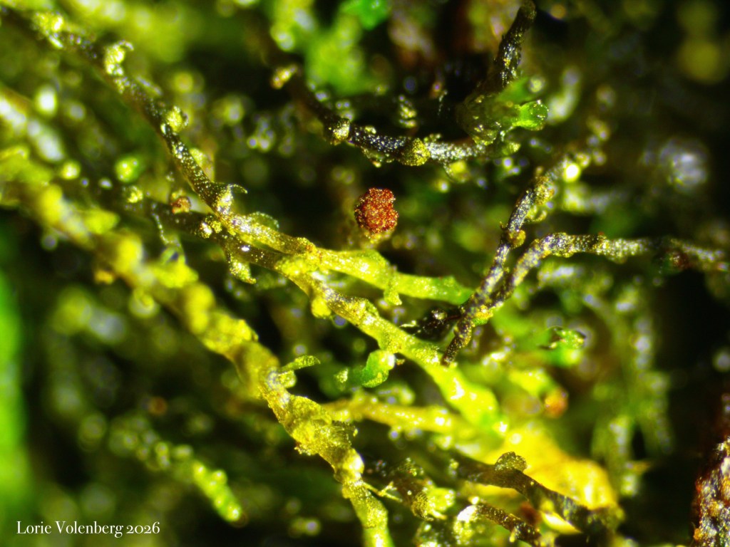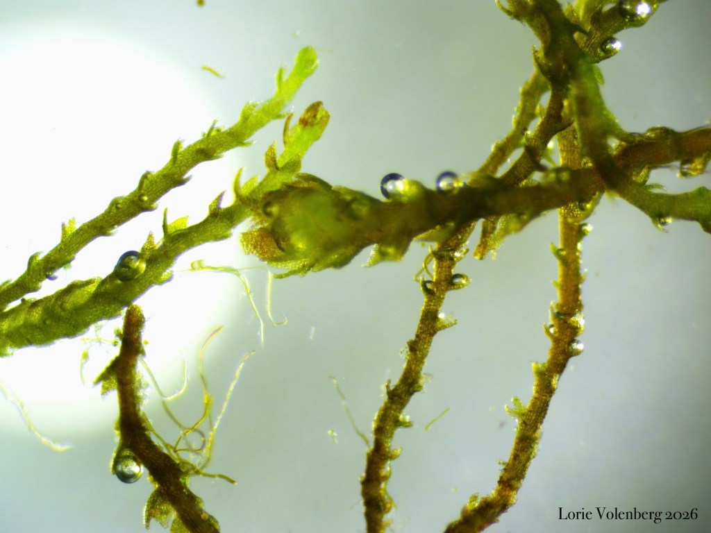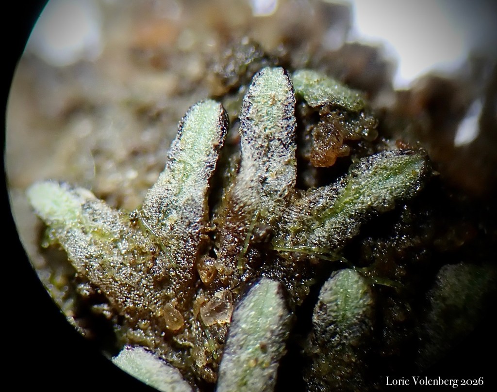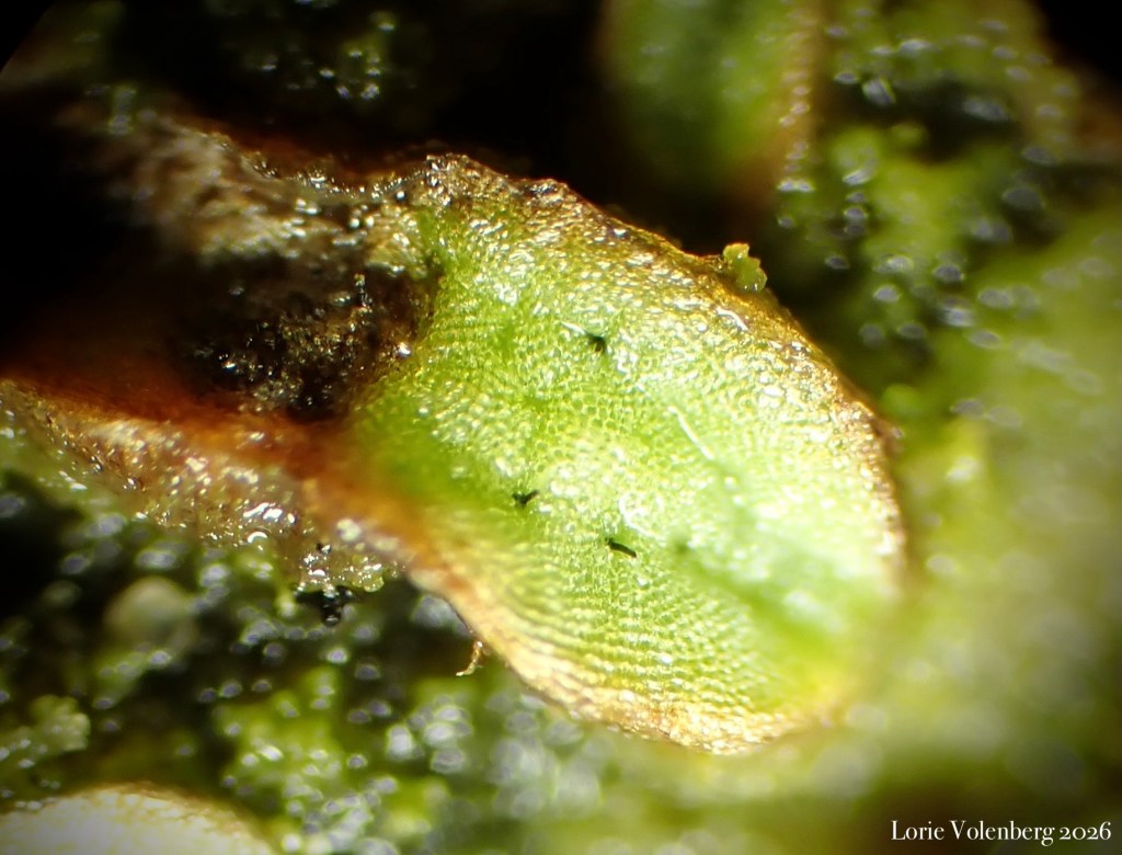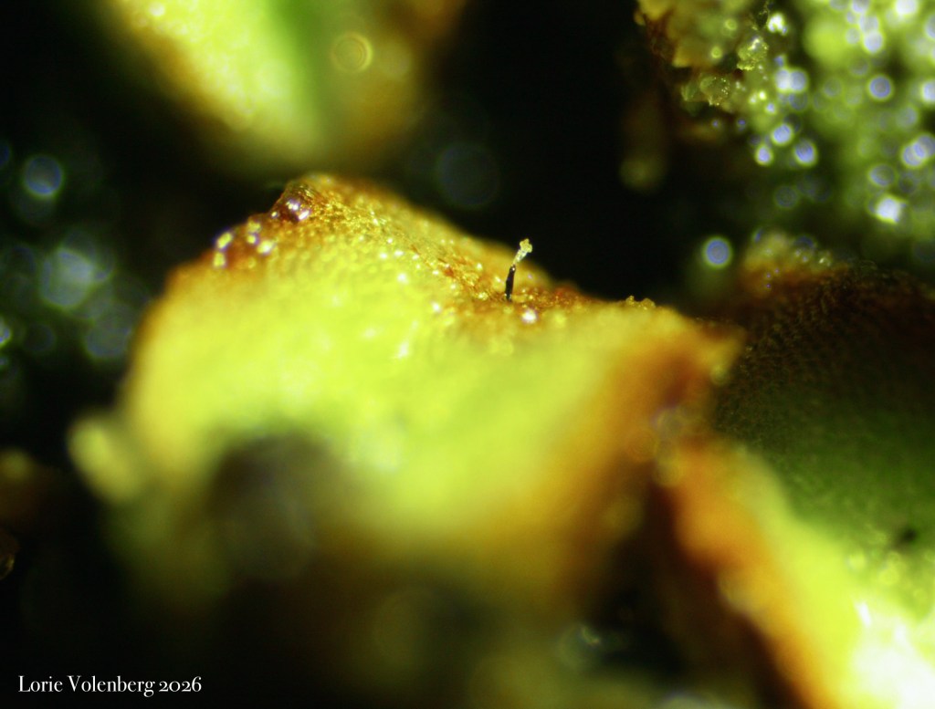 The leaves are extremely tiny, often under 0.2mm long. This population was producing gemma (the brownish tip you see) along with perianths.