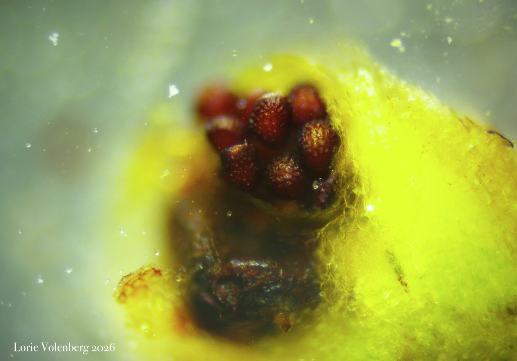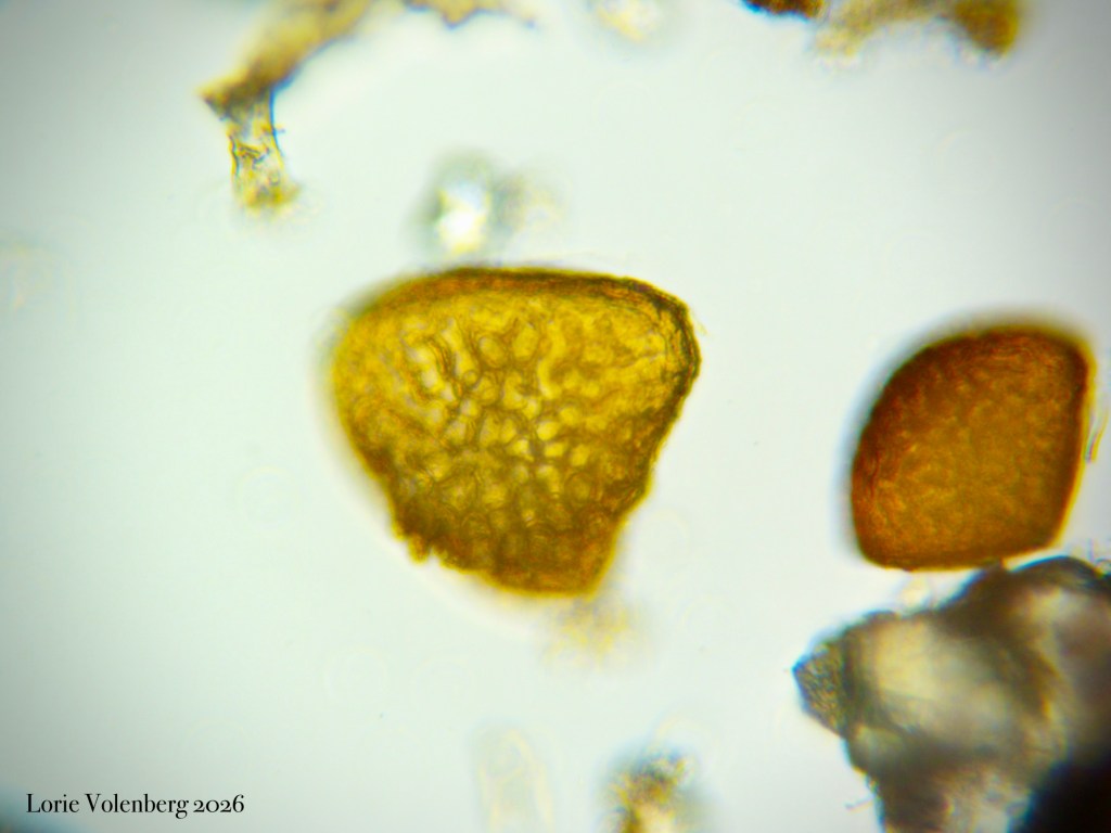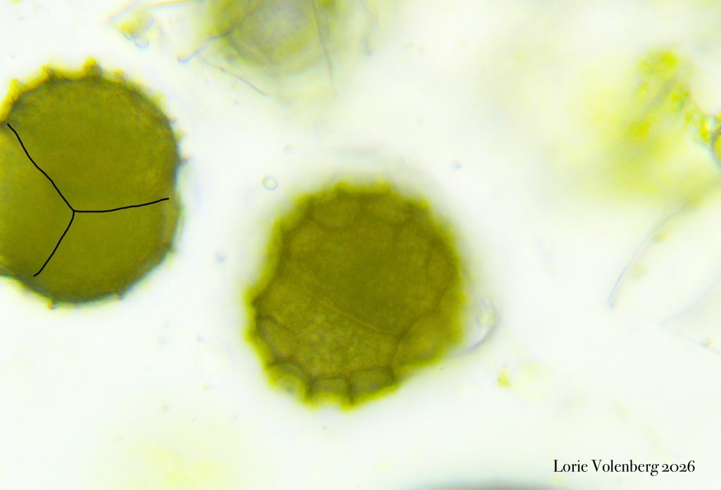 S. texanus has 5-7 areolae that are 15-25 um in diameter. I attempted to help distinguish the tetrads by adding a black marker on the spore on the left to show the units. The fourth is hiding behind the three in front.