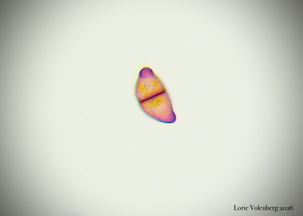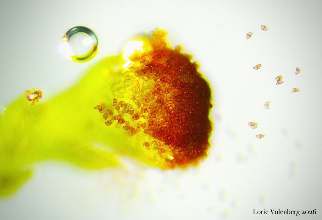 Per usual, we didn’t get very far before we were guided into the old meadow. Ariel and I dropped to our knees immediately and began to push aside the dead thatch, scoping the soil for any signs of little green life. Within 1 minute, Ariel triumphantly yells, “I found it! I found the bottle liverwort!!”. Sure enough, she found the unusual looking Sphaerocarpos texanus. The spores at home confirmed its identity.