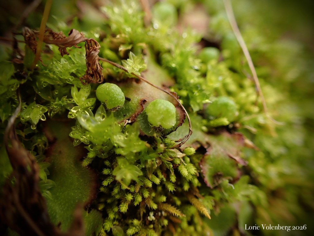 Above left: The ravine we followed down; Above middle: Amblystegium varium subs. varium sporting its sporophytes; Above right: The thalloid liverwort Reboulia hemisphaerica was just starting to push up its archegoniophores. The sporophytes are maturing underneath that cap-like structure that will continue to get higher as the stalk grows longer.