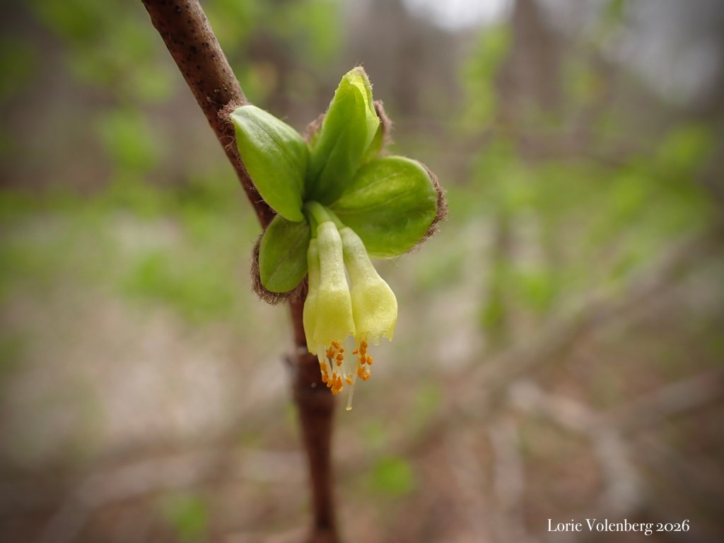 Once we reached the bottomland, we were amazed at how much of it was covered in the understory shrub, Dirca palustris, known as leatherwood tree. The branches are very bendable. At first, I thought we had missed the flowering window, but as we got closer to the creek, we came across flowers that were still in their prime.