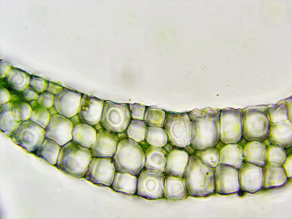 A cross section of Leucobryum glaucum which displays two types of cells. The green diamond shaped cells are the chlorocysts and contain chlorophyll. The clear cells are the halocysts which lack chlorophyll and store water.