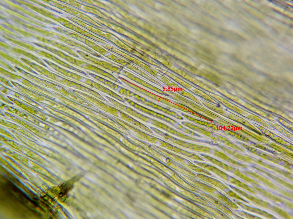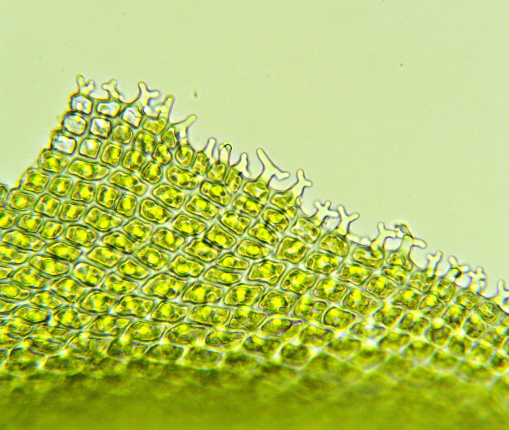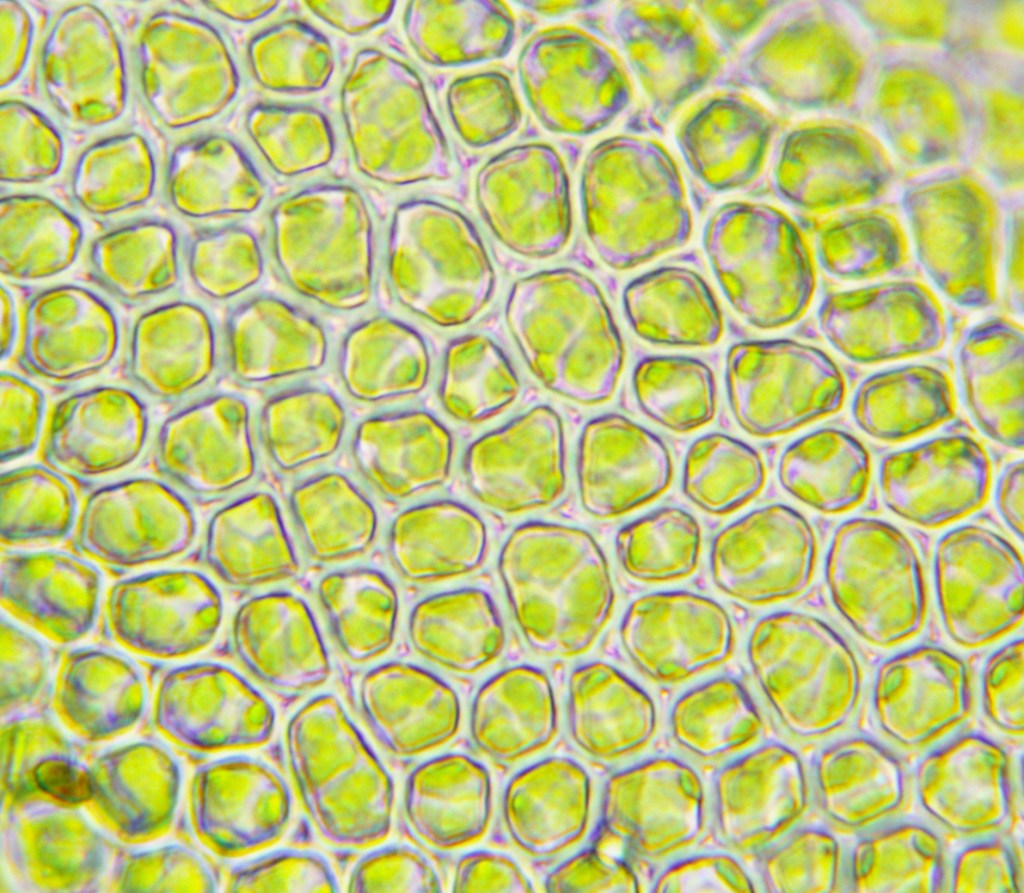 Above left: Long linear or fusiform cells of Brachythecium laetum. Above middle: rounded and thick-walled cells of Arrhenopterum heterostichum. The thick walls create a stellate appearance in the “corners” between the cells. Above right: Large blocky cells of Hygrometrica funaria with thin cell walls.