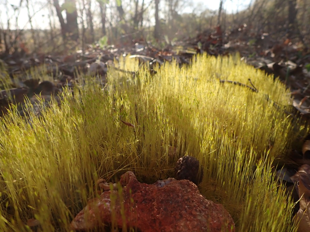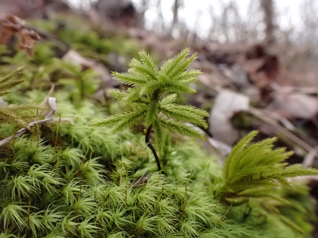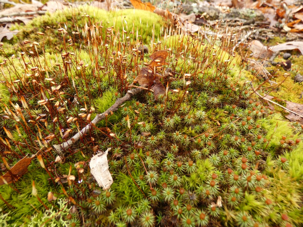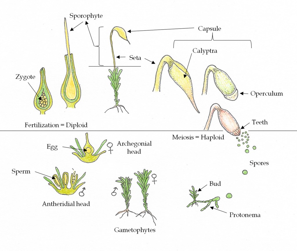 Like all bryophytes, moss has two stages of life: a dominant gametophyte stage, and a short-lived sporophyte stage. The gametophyte stage is haploid and is what we see most often out in the field. It consists primarily of a stem with rhizoids, and leaves that spirally radiate off of the stem.