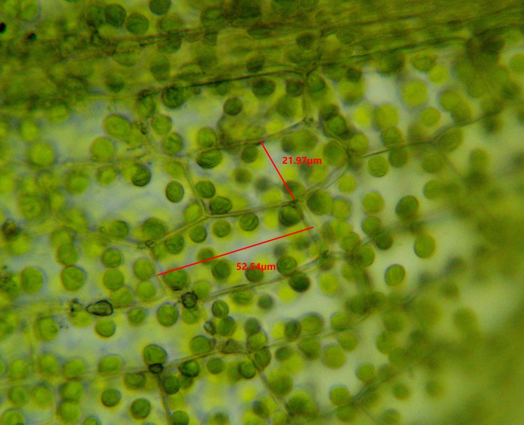 Cells range in sizes with some of the smallest being 5um in diameter, to longer ones up to 180um. Shapes can be squares, circular, hexagonal, and fusiform to name a few. Cell walls can be thin or thick, and they can be incrassate and porose. Most cells contain chlorophyll, and the number of chloroplasts per cell varies. Some species such as Sphagnum also have hyaline cells which lack chlorophyll, and their main function is to store water.