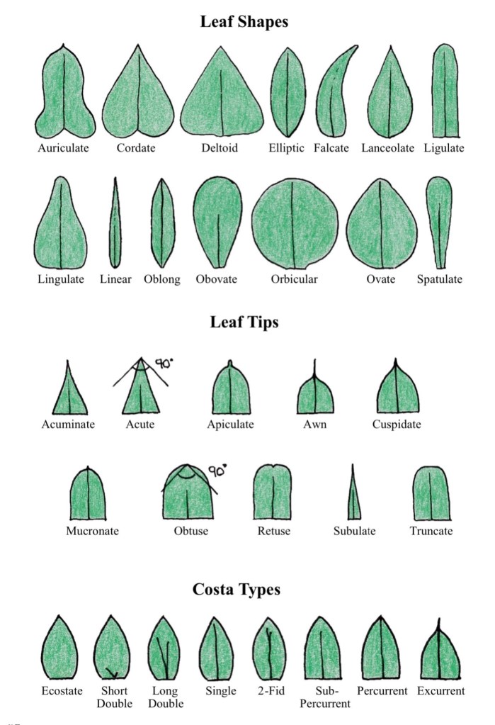 Leaves come in many shapes and sizes. The only shape you won’t find in species in Missouri or in the United States are highly bisected leaves. Leaf tips are also various ranging from rounded to pointed. Additionally, some species may have a costa running down the center of the leaf. The costa is several cells thick and may help in transporting nutrients, and it can also add strength to the leaf itself.