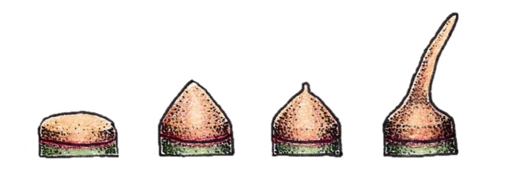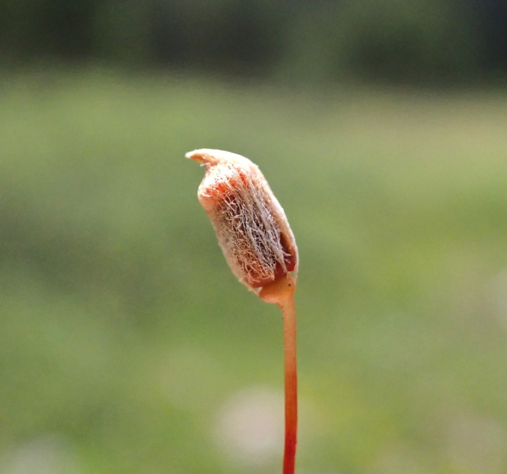 When a capsule is forming, it is protected by maternal tissue called a calyptra. Calyptrae come in two major shapes: cucullate and mitrate. It can be covered in hairs, or it can be naked. Some are large and cover most of the capsule, while others are small and merely sit at the top.