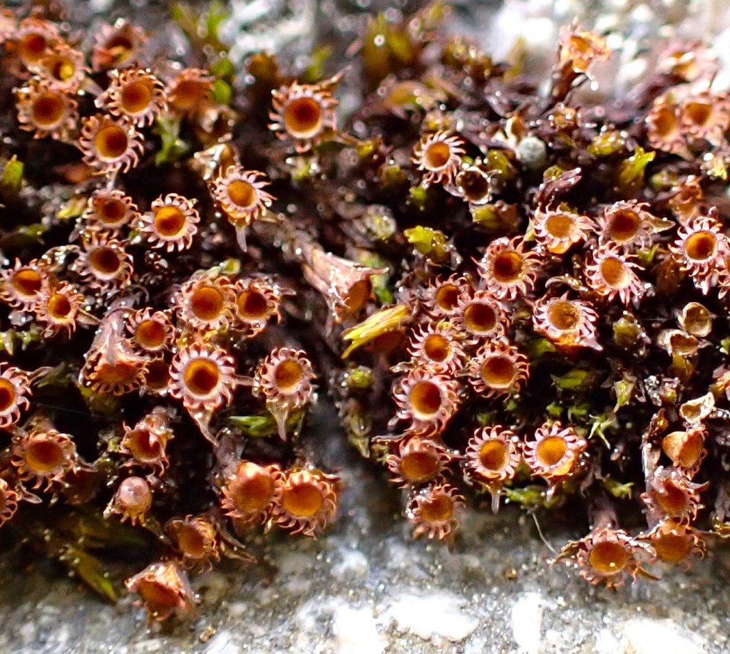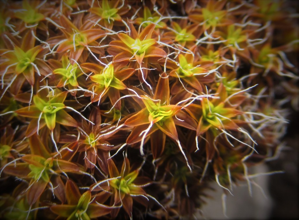 Above left: Syntrichia ruralis looks almost black when it is dry, but the gorgeous hyaline awns really stand out. Above middle: Syntrichia ruralis after hydration. Above right: Close up of Syntrichia ruralis sporting its winter colors of yellows and oranges.