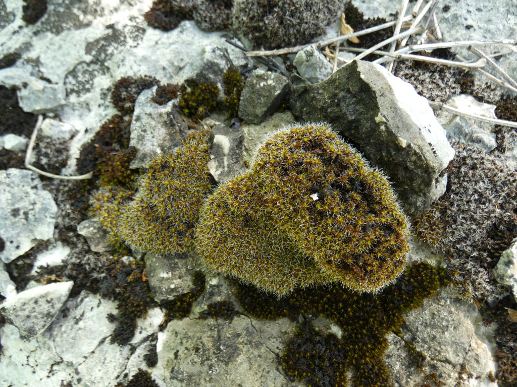 Above left: A Polytrichum species sports a cucullate calyptra that is covered in hairs. Above right: Schistidium viride has a tiny lobed mitrate calyptra that barely covers the top of the capsule.