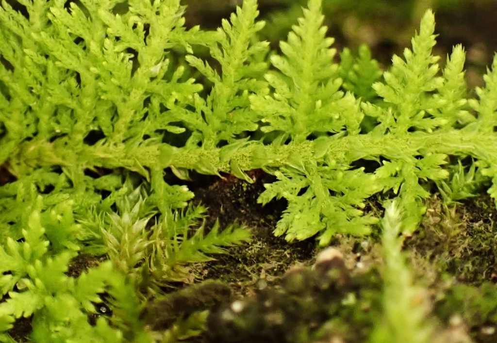 Above left: Climacium americanum is an upright moss that also exhibits a dendroid characteristic. Its upright stem is a stipe with small, scalelike leaves, while the branches have pronounced leaves and radiate outwards at the top. Above middle: Brachythecium rivulare ambles over its substrate and is regularly to irregularly branched. Top right: Thuidium delicatulum resembles a fern with its 2-3 pinnate branching which gives it its common name, delicate fern moss.